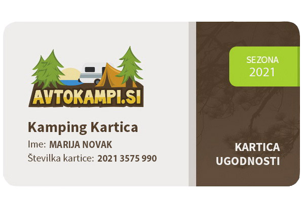 Gre za elektronsko kamping kartico, ki jo po naročilu na spodnjem obrazcu takoj dobite na vaš mail. V kampu jo ob prijavi na recepciji pokažete preko mobilnega telefona, lahko pa si jo tudi natisnete. Spisek kampov s popustom na kamping kartico.